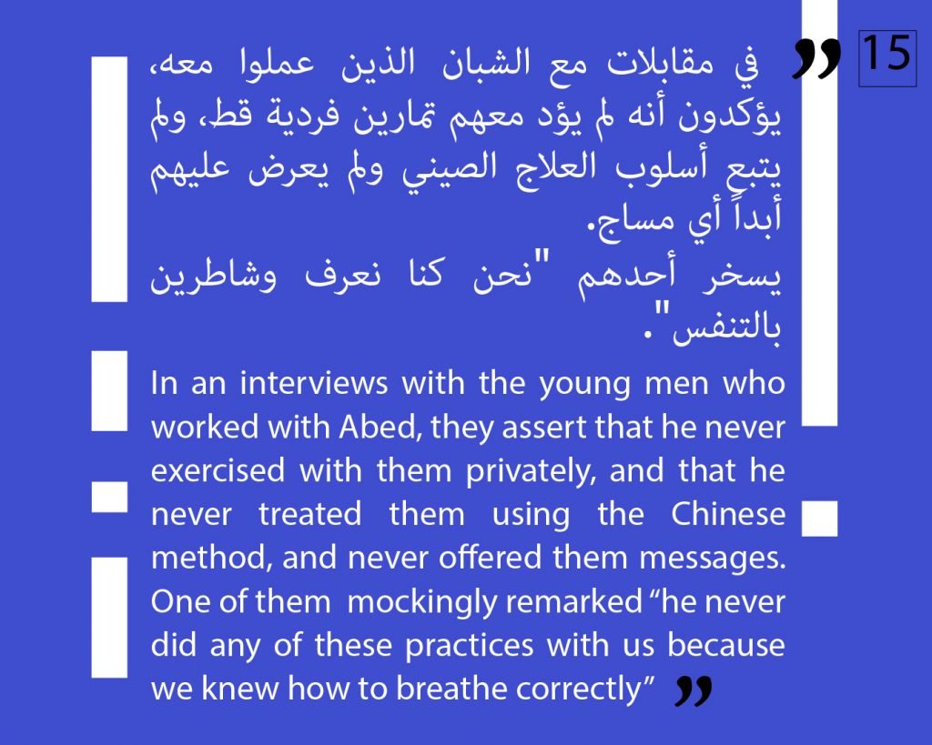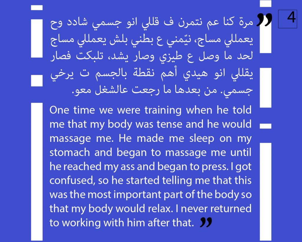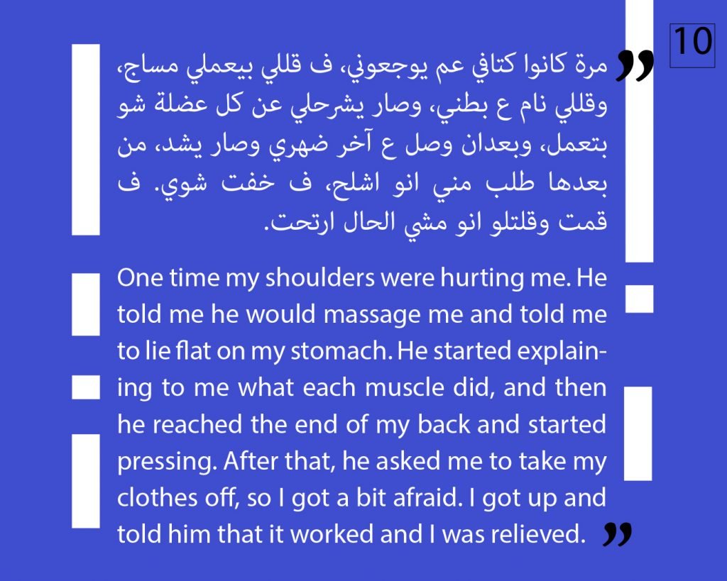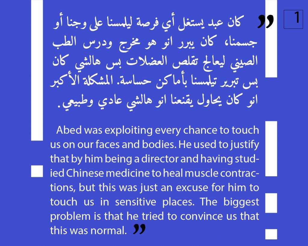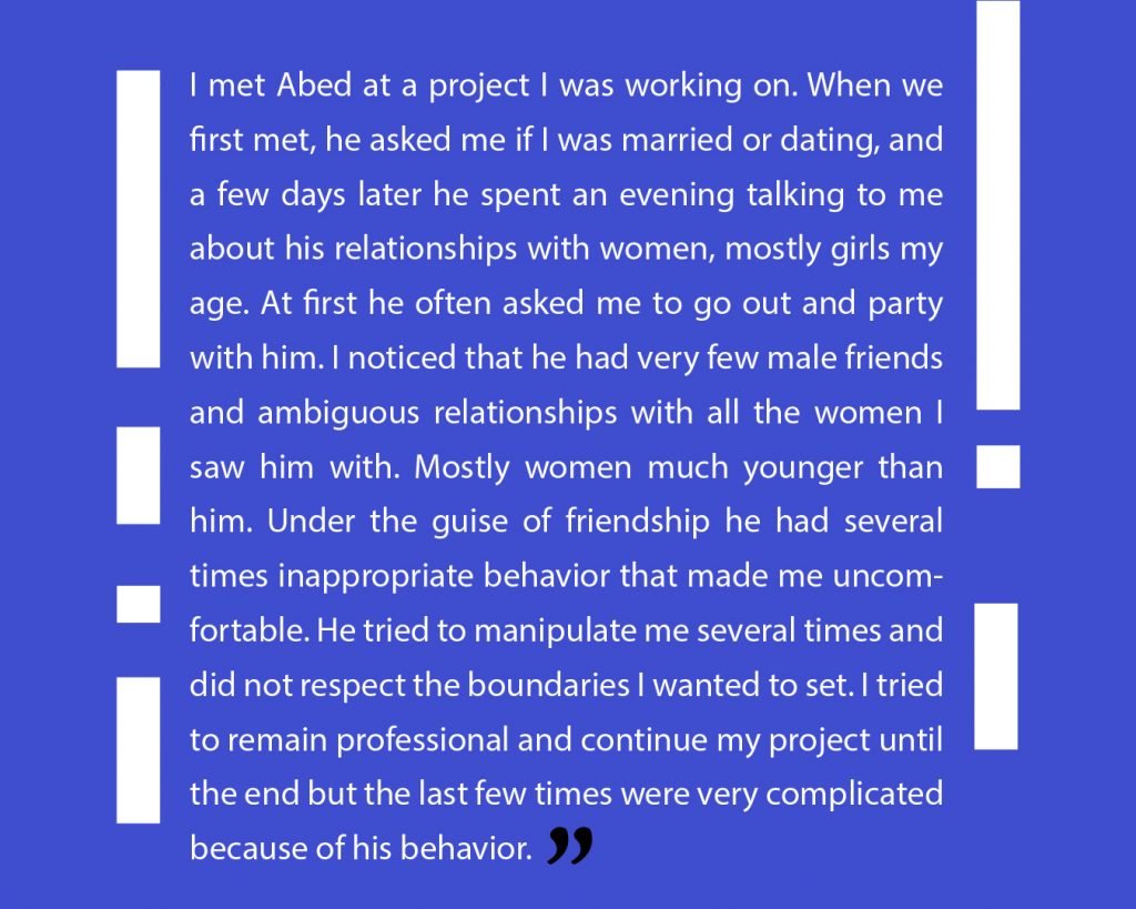 At this phase, we preferred to not publish other attestations in this regard, in order to preserve the safety of the victims/survivors. Later on, we aim to publish other testimonies that deal with the exploitation and the violence against children. We intend to also publish afterwards, information about the parties that provided cover for these violations, both individuals and organizations, or who ignored the complaints submitted against Al Aedi.