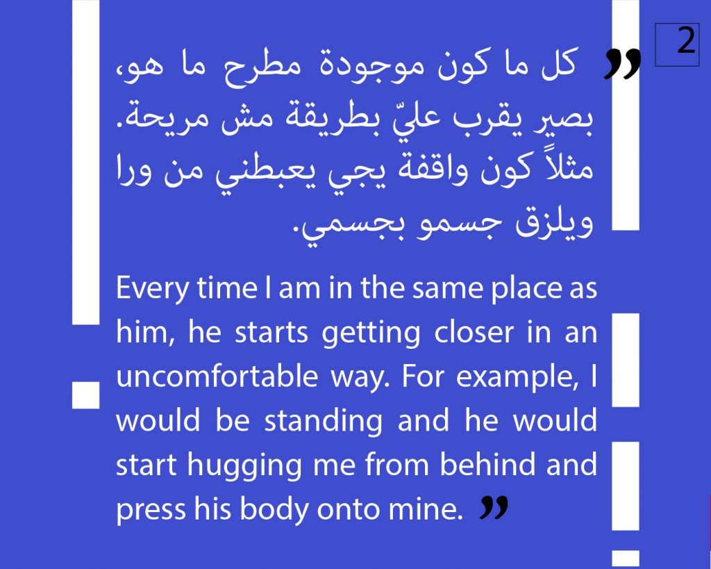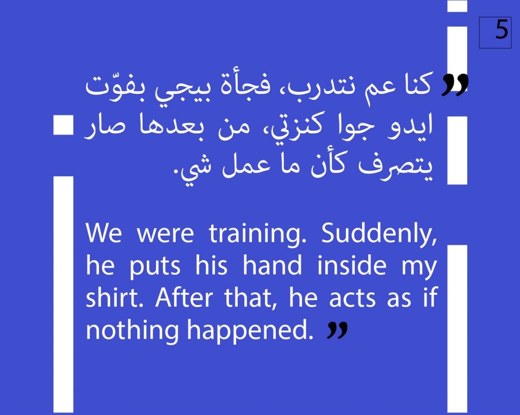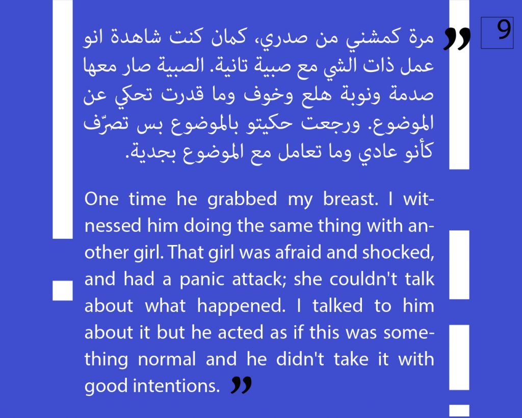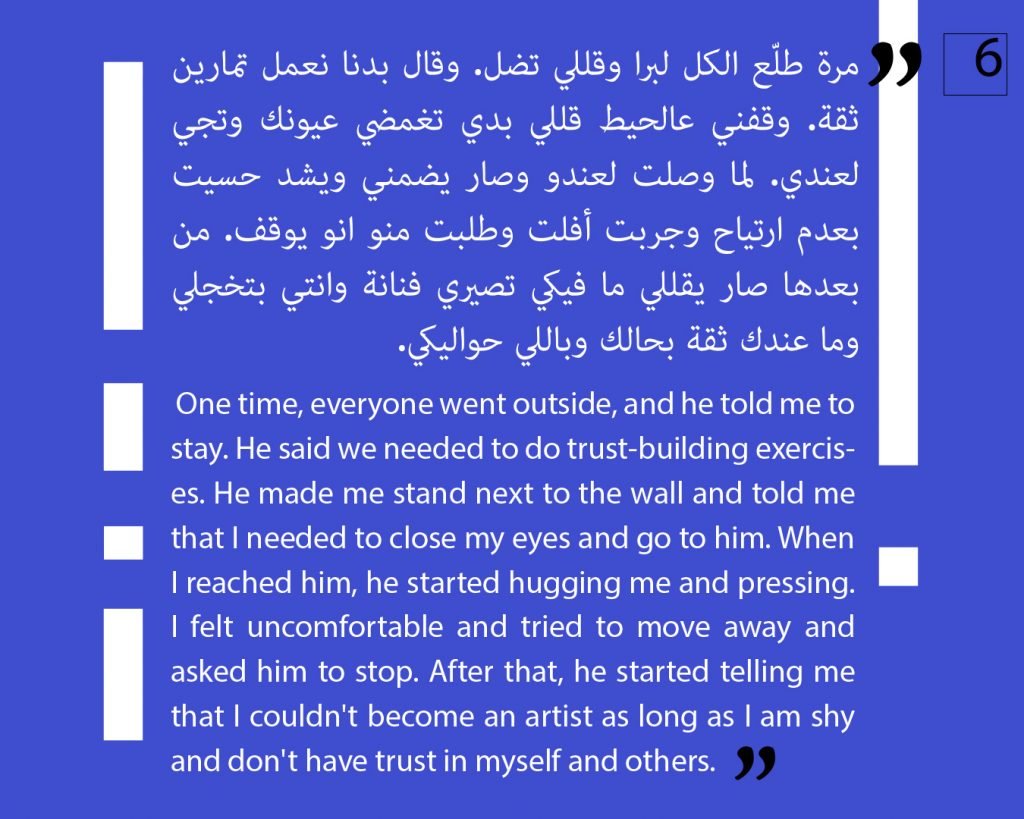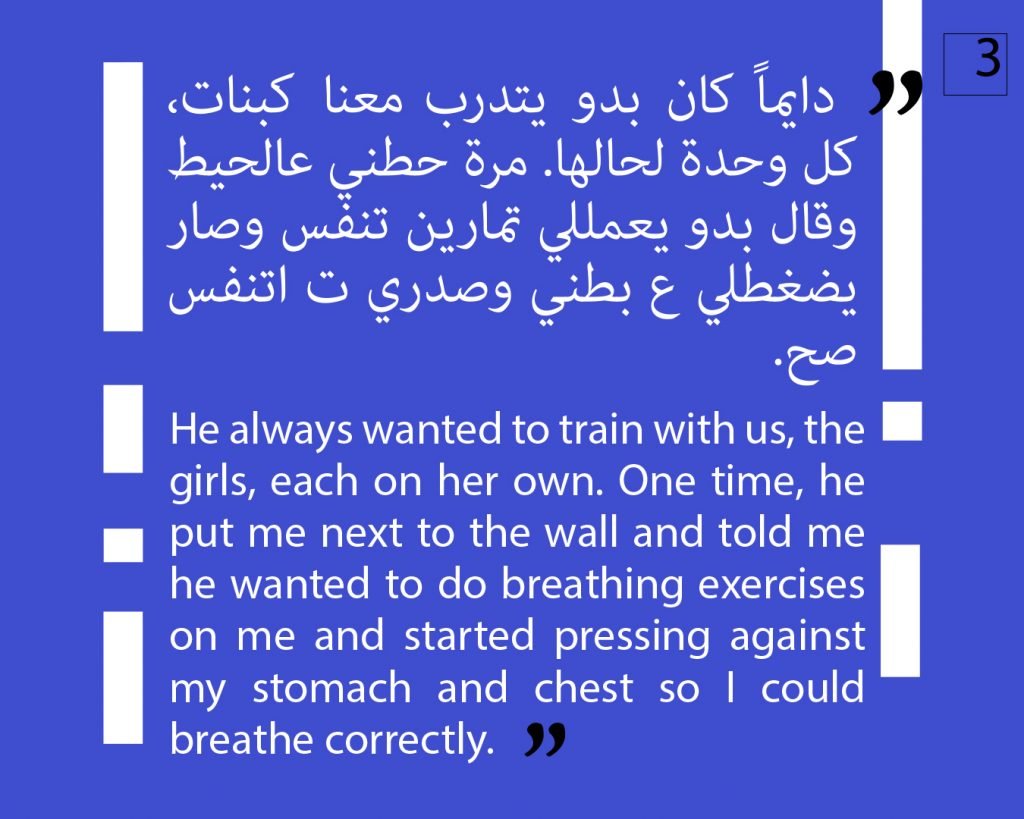 At this phase, we preferred to not publish other attestations in this regard, in order to preserve the safety of the victims/survivors. Later on, we aim to publish other testimonies that deal with the exploitation and the violence against children. We intend to also publish afterwards, information about the parties that provided cover for these violations, both individuals and organizations, or who ignored the complaints submitted against Al Aedi.