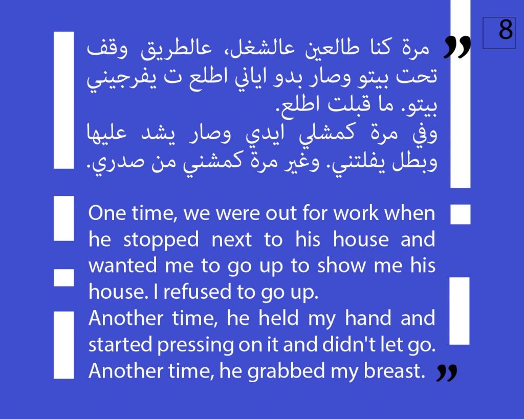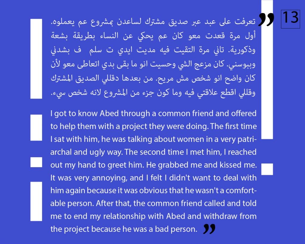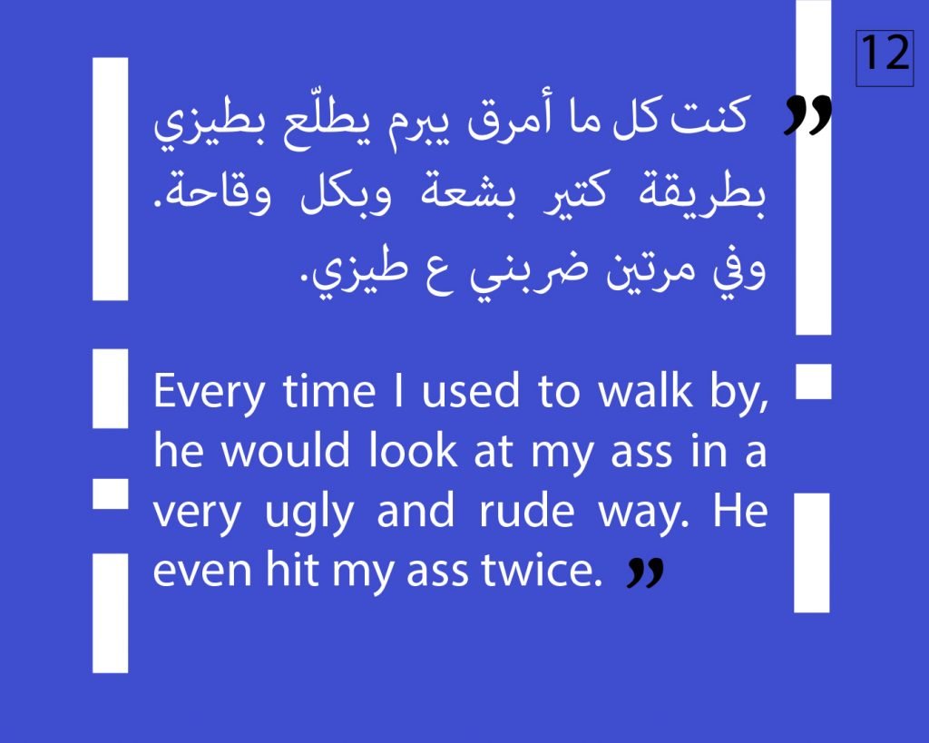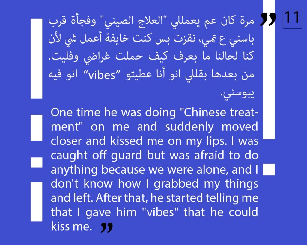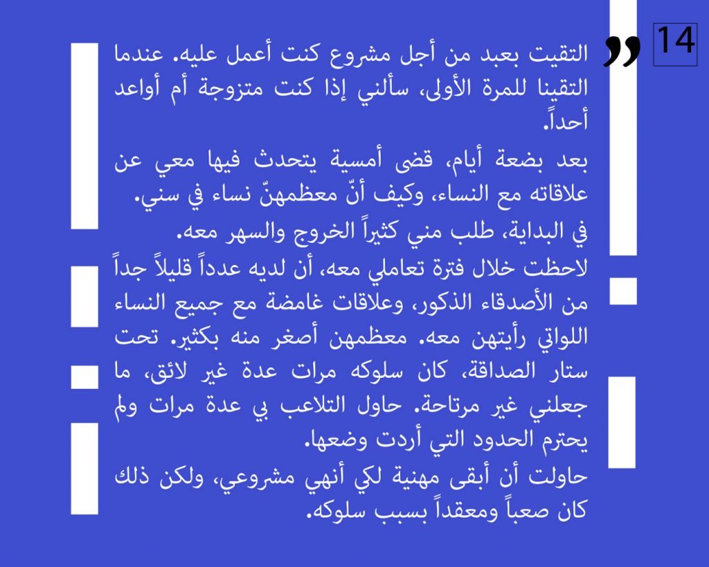 At this phase, we preferred to not publish other attestations in this regard, in order to preserve the safety of the victims/survivors. Later on, we aim to publish other testimonies that deal with the exploitation and the violence against children. We intend to also publish afterwards, information about the parties that provided cover for these violations, both individuals and organizations, or who ignored the complaints submitted against Al Aedi.