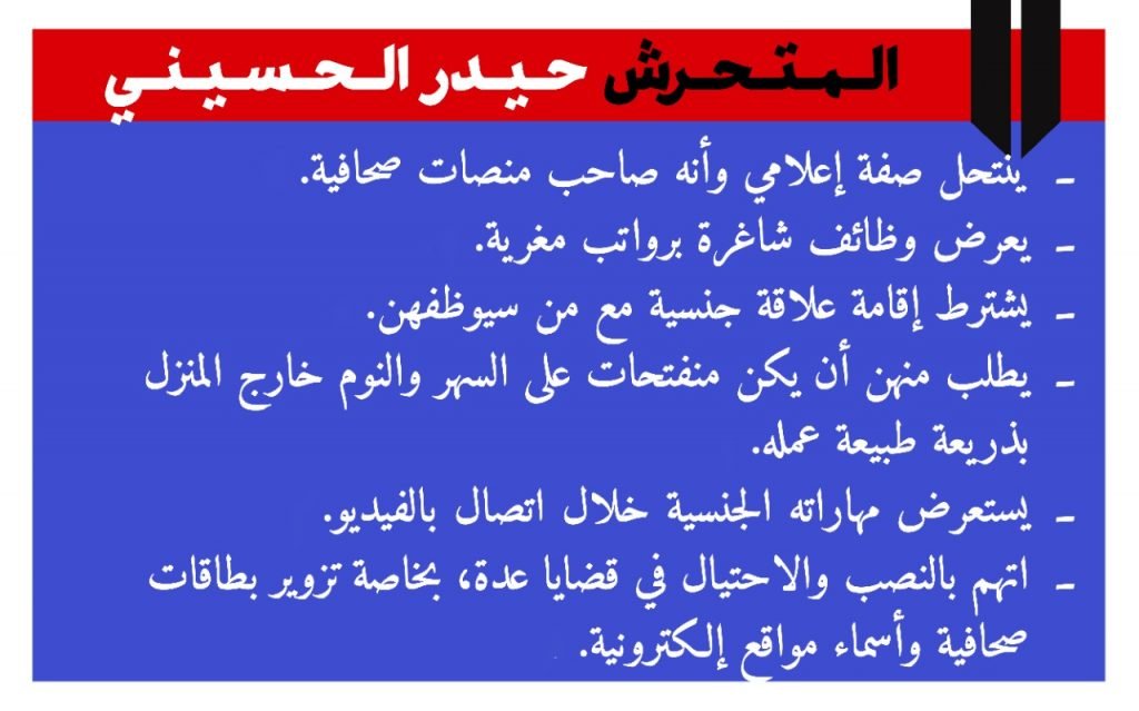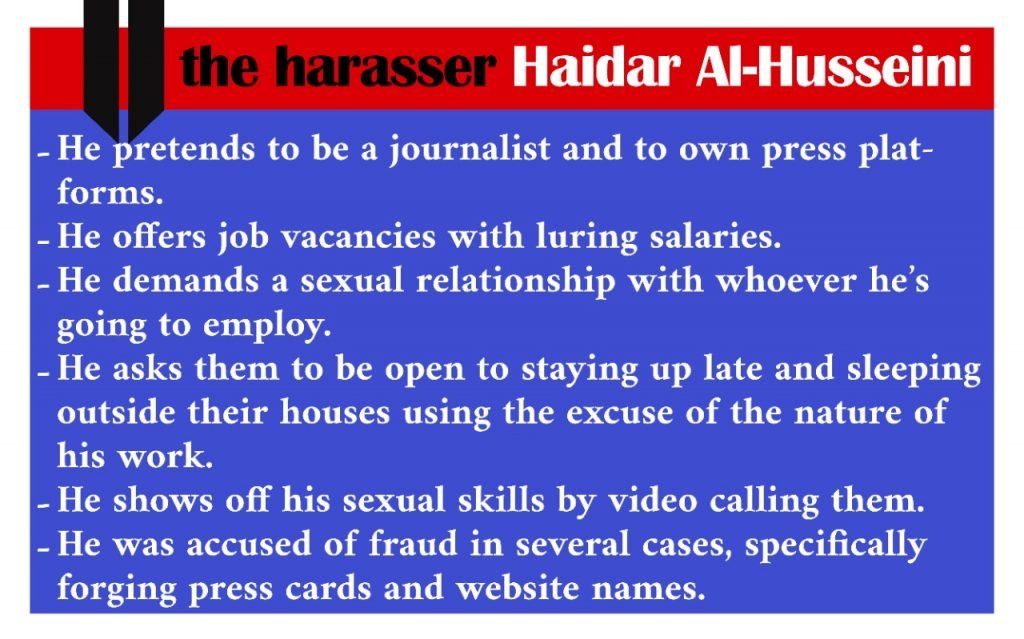 Last Sunday, journalist Rania Hamza published, on Facebook, a testimony about her being harassed by Haidar Al-Husseini, who is known for impersonating a journalist.