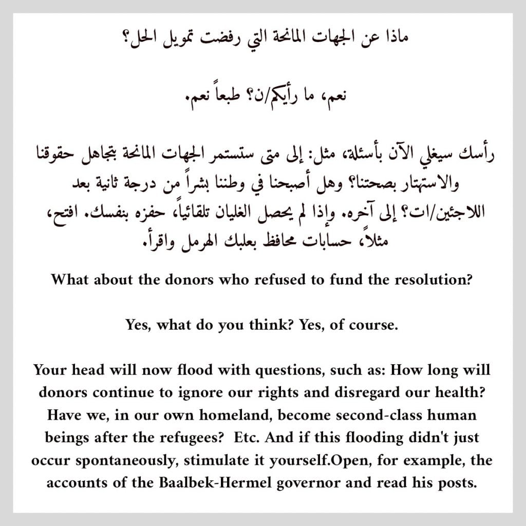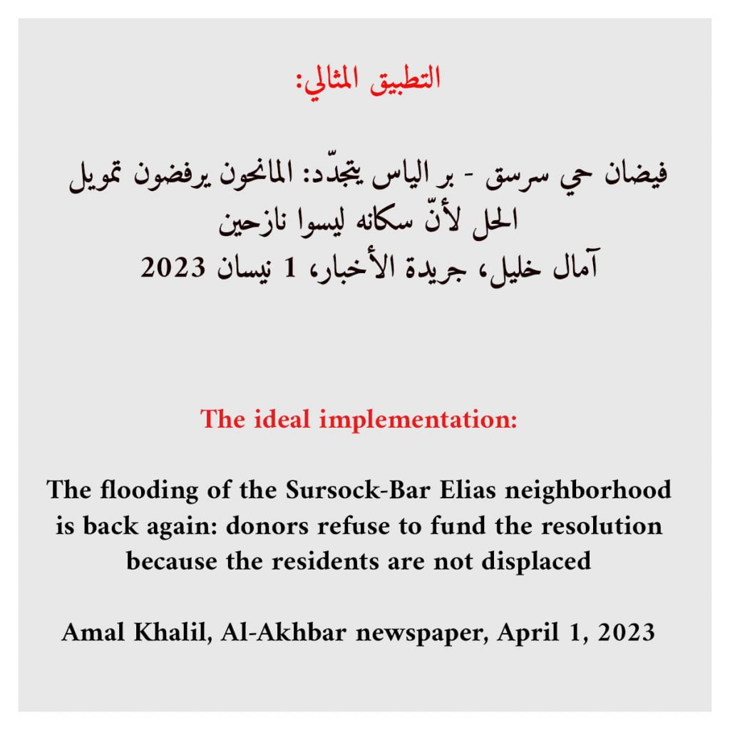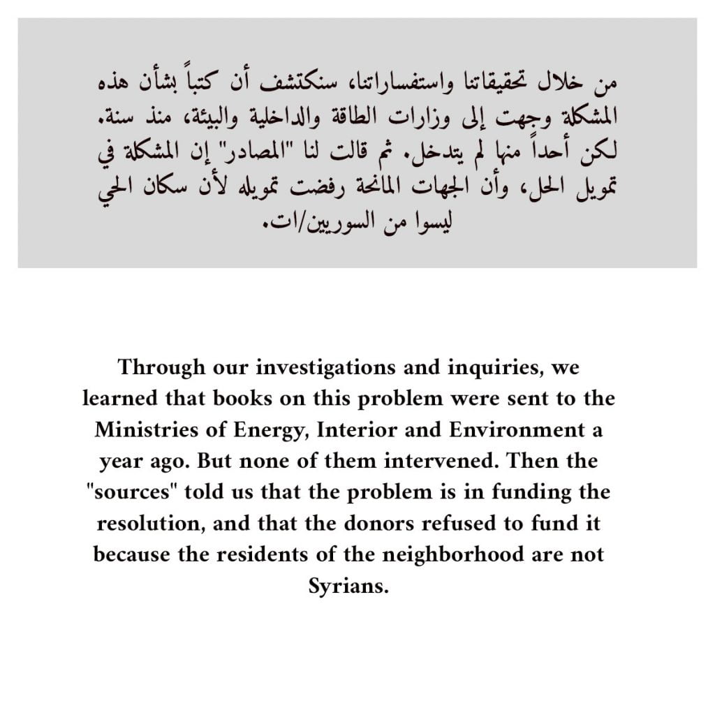 In fact, duty obliges us to thank the journalist Amal Khalil and Al-Akhbar newspaper. Without them, we would not have known that the refugees are involved (but with them not even being present this time) in delaying the solution to the sewage problem in the Sursock neighborhood in Bar Elias.