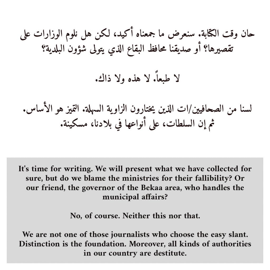 والحال أن الواجب يُلزمنا بأن نشكر الصحافية آمال خليل وجريدة الأخبار. فمن دونهما، لما كنا عرفنا أن اللاجئين/ات متورطون (لكن بغيابهم/ن هذه المرة) بتأخير حل مشكلة الصرف الصحي في حي سرسق في بر الياس.