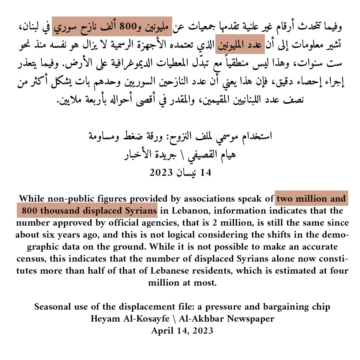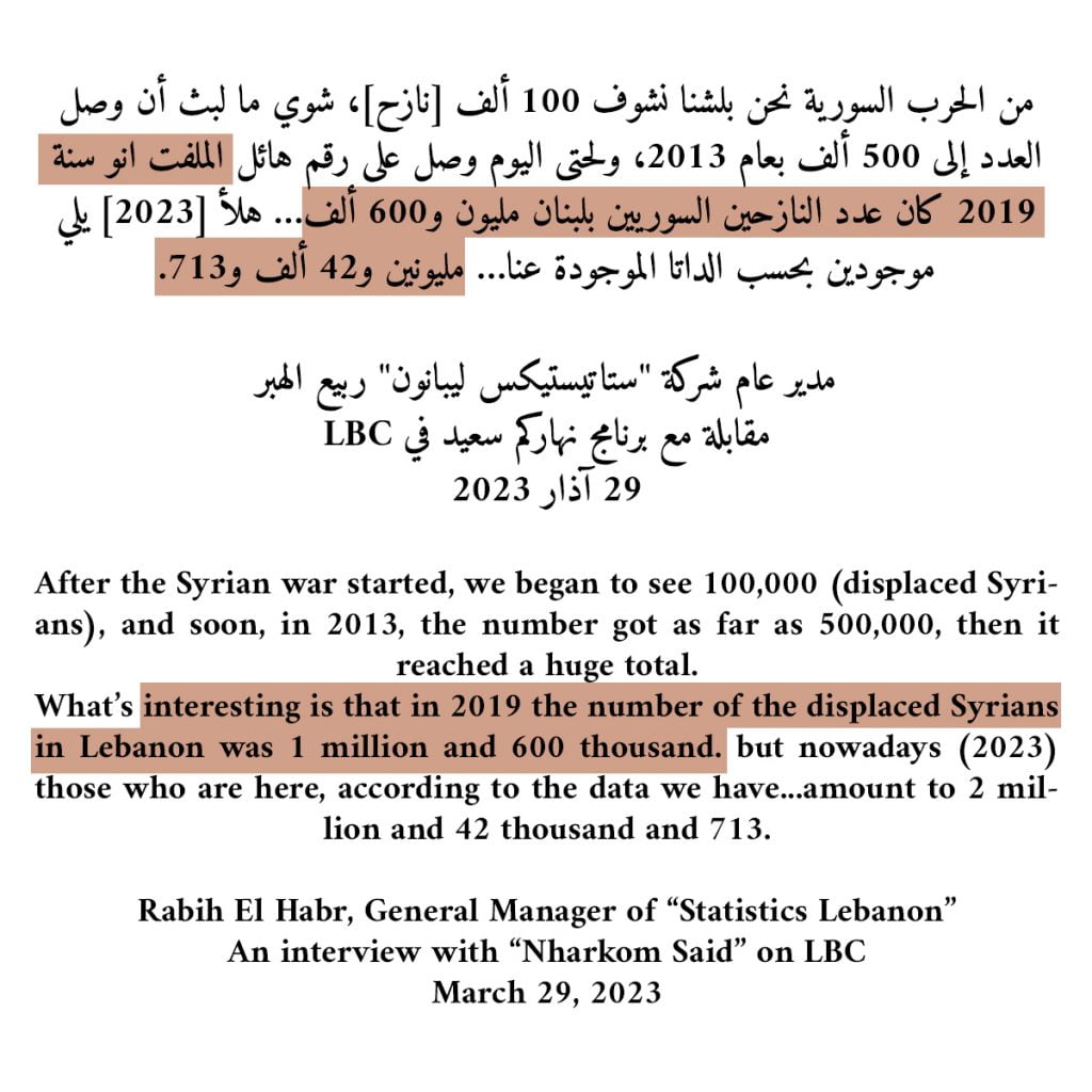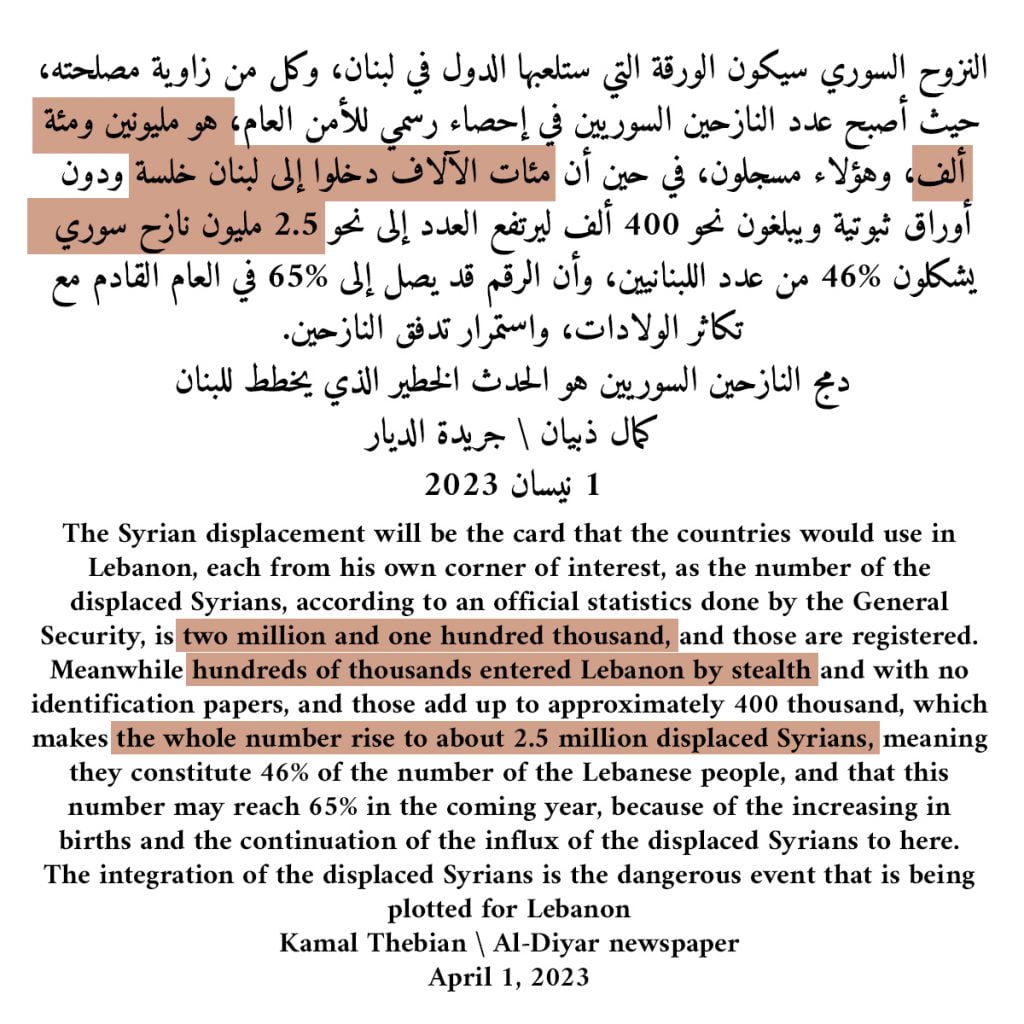 Third, as the number of Syrians in Lebanon is growing at breakneck speeds, the Lebanese population, through comparison and calculation of percentages, has stabilized at four million. How and for what reason, no one knows.
