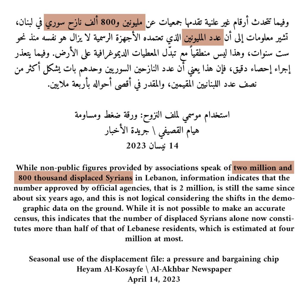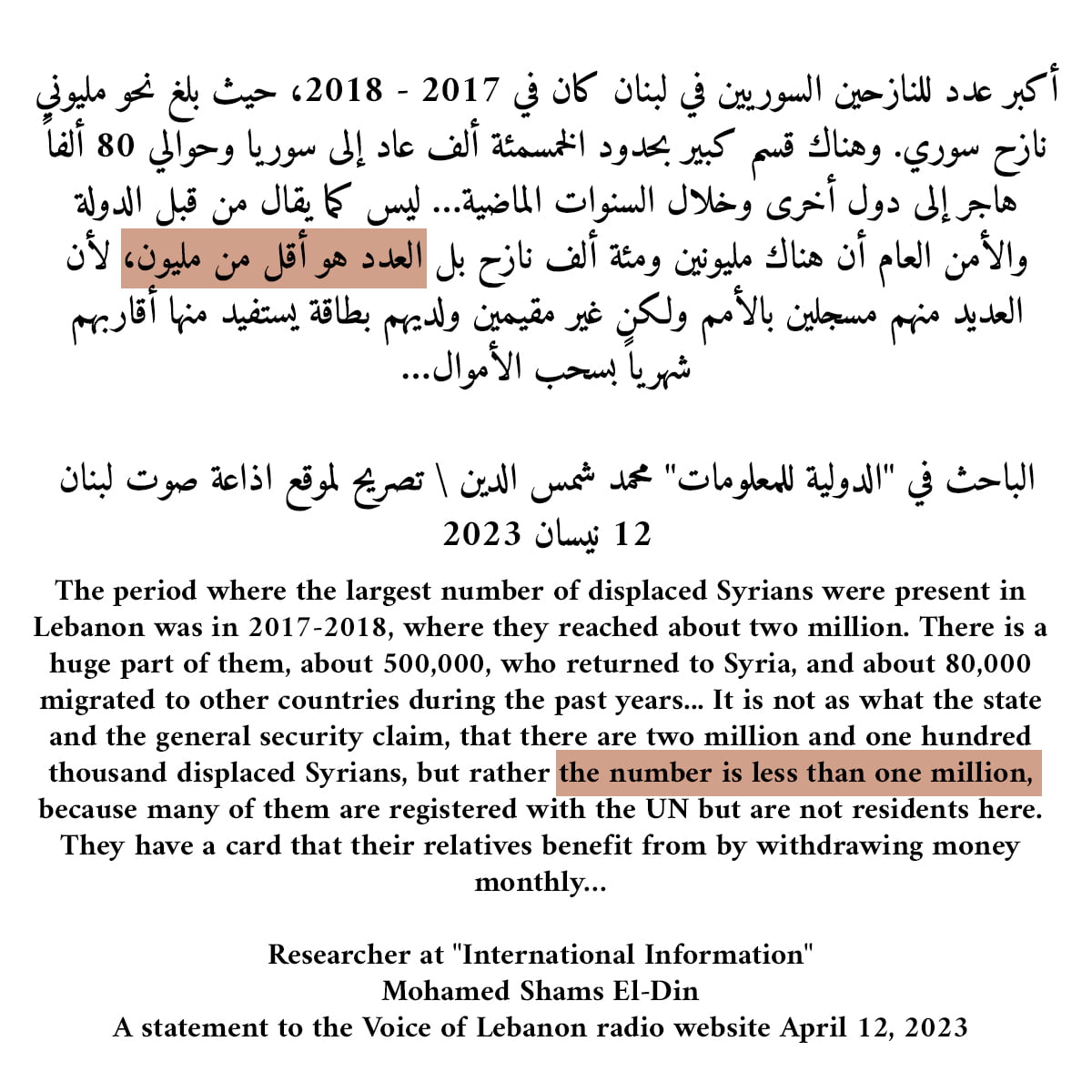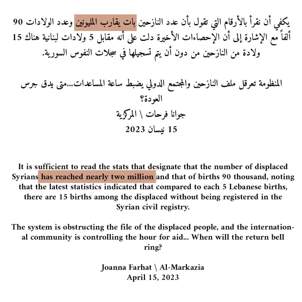 Third, as the number of Syrians in Lebanon is growing at breakneck speeds, the Lebanese population, through comparison and calculation of percentages, has stabilized at four million. How and for what reason, no one knows.