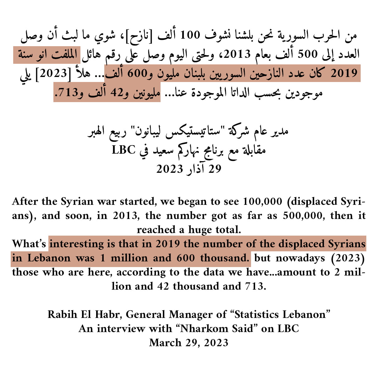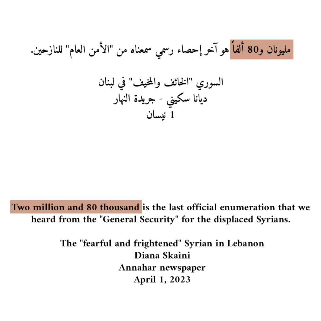 أولاً، الأرقام التي نعرضها هنا، بالاستناد إلى بعض ما نشره الإعلام اللبناني خلال أقل من شهر واحد، قد تتلاقى وتتباعد عن بعضها، فلا يكون لفارق يقدر بعشرة آلاف إنسان/ة أو مئات الآلاف أو حتى مليون، بين إحصاء وآخر، أي قيمة. وهذا مفهوم. فالعد، في هذا السياق، لا يهدف إلا للتهويل والتخويف. وهو ما لا يبدو بعيداً عن استعماله المعتاد في «سياقاتنا اللبنانية».