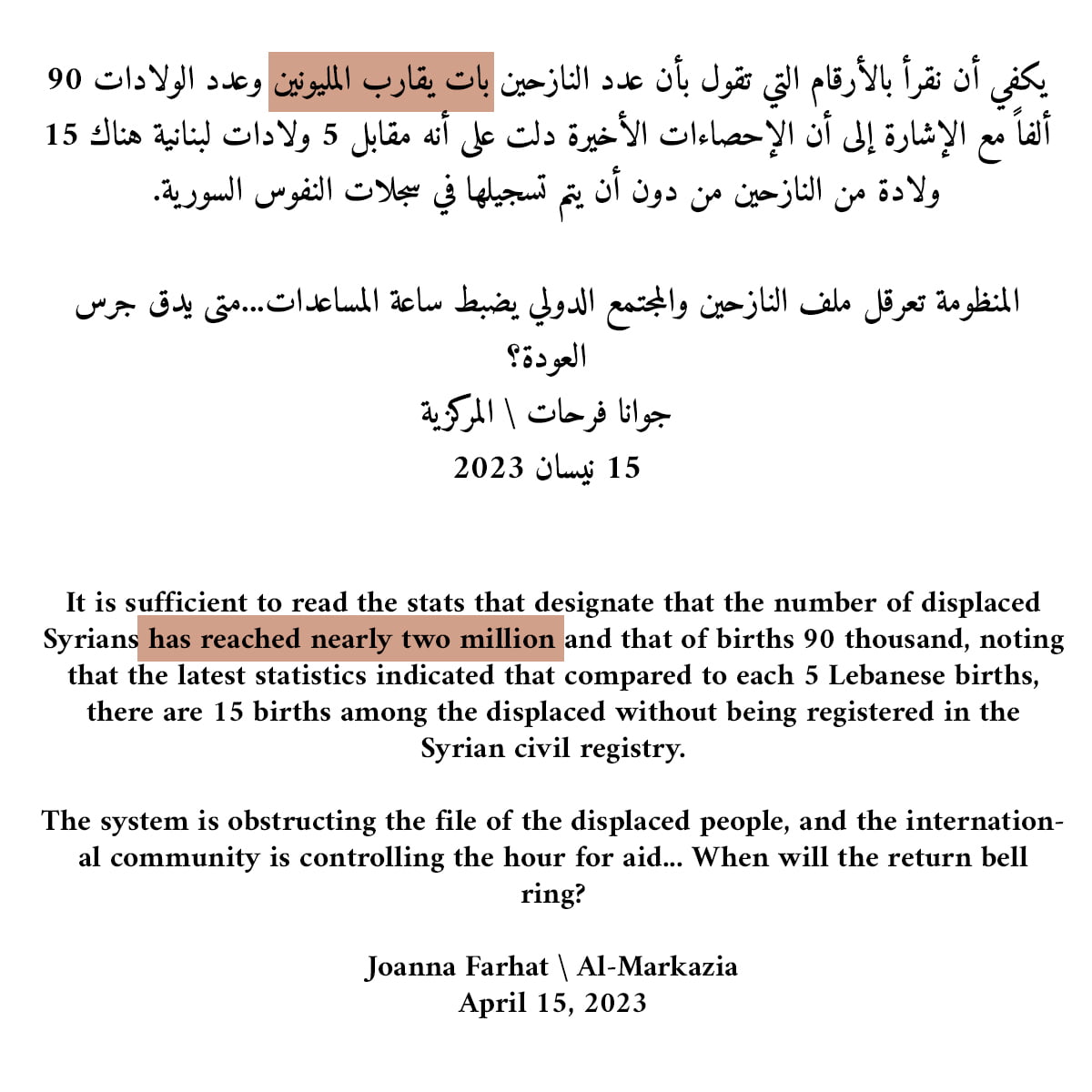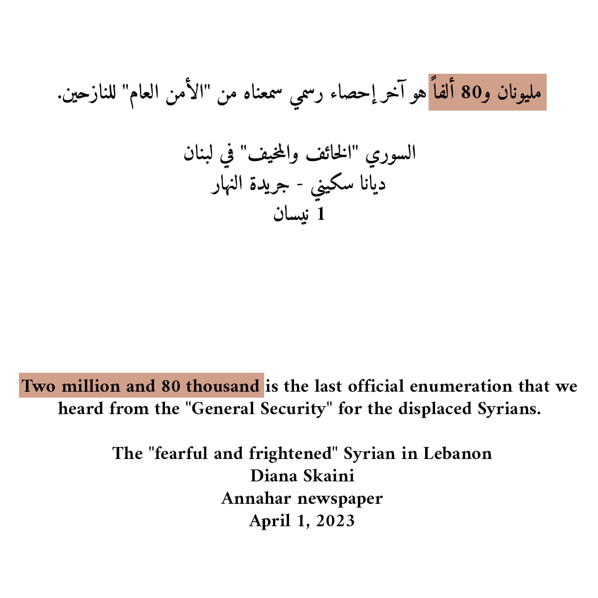If a society is frightened from enumerating its own individuals, it seems paradoxical that its skills explode when it comes to enumeration of others. Consequently, we find ceaseless statistics on the number of Syrian refugees in Lebanon, and no one knows how they are obtained, or what they are based on. However, three observations can be made regarding them: