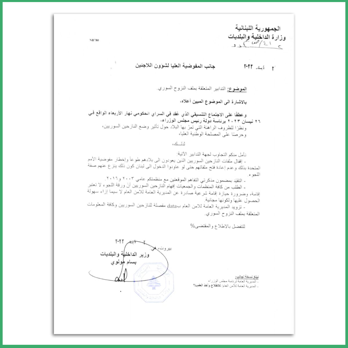 في 2 أيار 2023، وجه وزير الداخلية في حكومة تصريف الأعمال بسام مولوي كتاباً إلى مفوضية الأمم المتحدة لشؤون اللاجئين بشأن «التدابير المتعلقة بملف النزوح السوري».