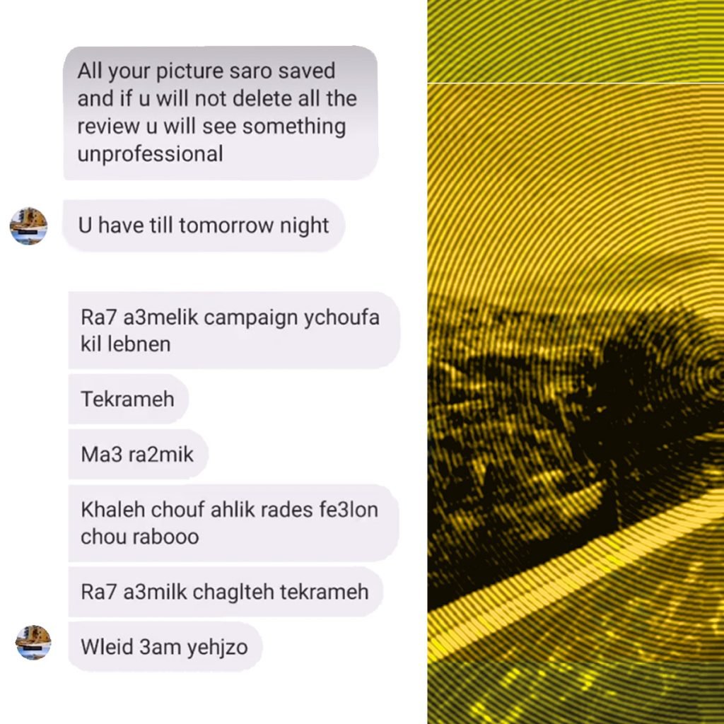 وكان هذا التهديد يهدف، وفق ما قال لها، إلى إجبارها على حذف تقييمات سلبية للشاليه، كتبتها مع أصدقاء لها، بعد أن ألغى حجزاً لشقتين كانت اتفقت عليه معه قبل نحو أسبوعين، بذريعة عدم دفعها مسبقاً عربوناً، لم يطلبه منها، وفق روايتها. وقد أمهلها حتى مساء الثلاثاء الماضي لحذف التقييمات، وهو ما لم يحصل.